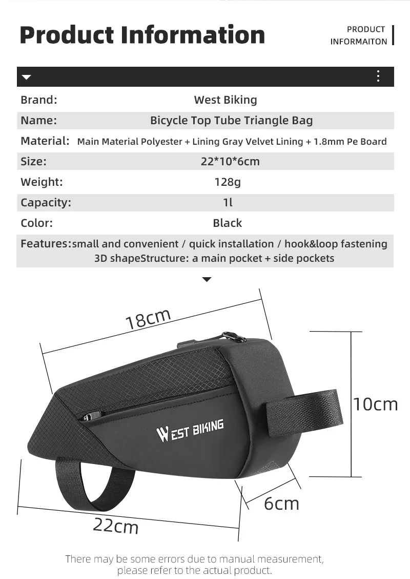 Join the countless cyclists who have elevated their riding experience with West Biking products. The YP0707339 Top Tube Bag is a testament to our commitment to innovation, quality, and functionality. Experience the difference for yourself and make every ride an adventure with this exceptional bicycle front frame bag.